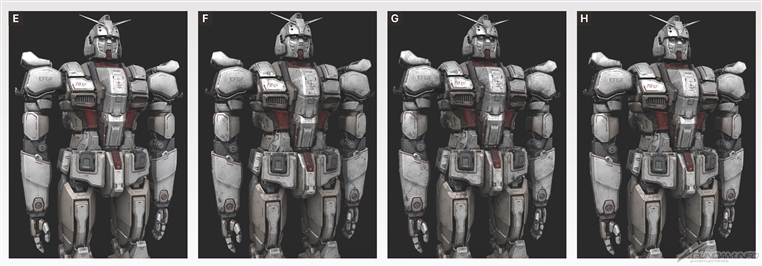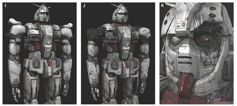 F~J:ガンダムEXの壊れバージョンは5体つくられ、各話の戦闘状況に合わせて使い分けられた。「Brosdau監督が各話の壊れバージョンを何枚も描いてくれたので、それらを笠岡さん(ディレクター・オブ・フォトグラフィ 笠岡淳平氏)と一緒に整理して、5体に絞り込みました。単純に壊れていくだけではなく、基地に戻って整備された後は、1回リセットして汚れを減らしたりといった調整もしています」(鈴木氏)