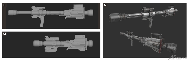 「MSの武器だけでも20個以上あったので、モデリングアーティストの方からデザインを提案させていただく場合もありました。山根さんは快く受け入れてくださったので、楽しかったです。ロケットランチャーは展開時のままだと持ち運びしづらかったので、短く畳んで背中に装着できるしくみを提案しました。伸縮ギミックはつくらず、カット単位でいずれかを使い分けています」(鈴木氏)