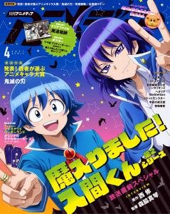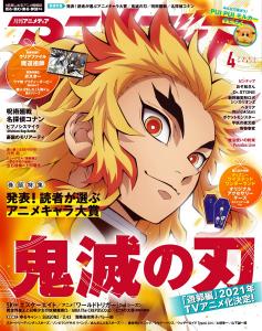 アニメディア4月号のカバー(表紙)は、アニメ『鬼滅の刃』煉獄杏寿郎のイラストが目印。裏表紙には、『魔入りました!入間くん 第2シリーズ』より入間くんと悪入間くんの2人が登場。