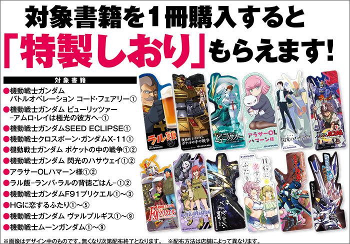 本フェアは、対象店舗で、「機動戦士ガンダム バトルオペレーション コード・フェアリー」や「機動戦士ガンダム ピューリッツァー ―アムロ・レイは極光の彼方へ―」などの対象書籍を1冊購入すると、特製の「型抜きしおり」がプレゼントされるというもの。