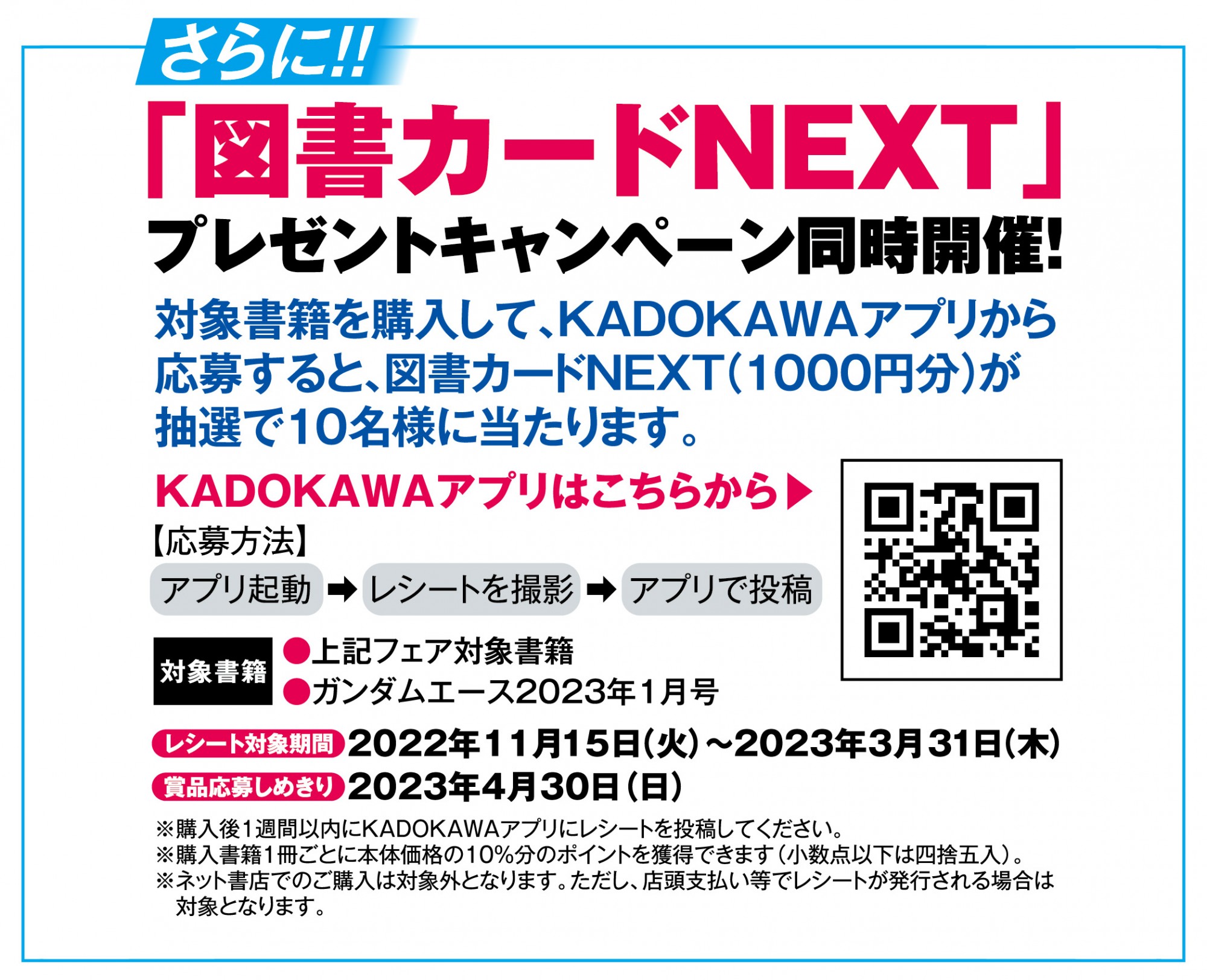 また、「図書カードNEXT」プレゼントキャンペーンも実施中。「水星の魔女フェア」対象書籍や、11月26日(土)発売の「月刊ガンダムエース 2023年1月号」を購入し、KADOKAWAアプリにて購入レシートを投稿することで、「図書カードNEXT」(1,000円分)が抽選で10名にプレゼントされる。こちらもお見逃しなく。