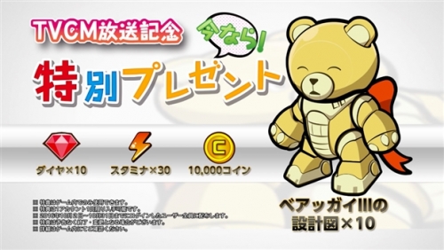 TV CM放送を記念して、全ユーザーにダイヤ10個、スタミナ30個、10,000コイン、ベアッガイIIIの設計図10枚がプレゼントされる。10月31日(月)までにログインして、ぜひともプレゼントを受け取ろう。
