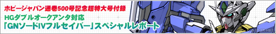 「月刊ホビージャパン」は、2010年12月25日に発売となる2011年2月号で通巻500号を迎えます。その「通巻500号記念超特大号」の付録となる特製ガンプラが、「HGダブルオークアンタ対応 GNソードIVフルセイバー」です。その発表以来、ガンダム&ガンプラファンから熱い支持を得ているGNソードIVフルセイバーが、あと1ヵ月で皆様のお手元に配備されます!!