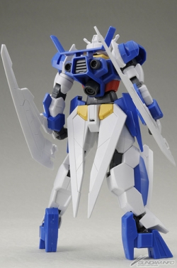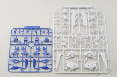 ▲頭部・胴体・腰部、および各関節パーツは、発売中の「HGガンダムAGE-1 ノーマル」(税込定価1260円)を使用。これにガンダムAGE-1 レイザーのパーツを特製ガンプラで再現します。成型色は白と青の2色となり、組み立てるだけでほぼ設定通りのイメージカラーとなるのです(注意:部品構成上HGガンダムAGE-1 タイタス、およびHGガンダムAGE-1 スパローは「ガンダムAGE-1 レイザー改造ウェアパーツ」に対応していません)。