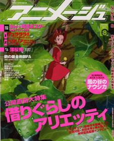 今月号は、7月17日(土)公開のスタジオジブリ最新作『借りぐらしのアリエッティ』が表紙&巻頭特集に登場です! ジブリ最年少監督として期待の集まる新鋭・米林宏昌監督のインタビューをはじめ、アリエッティ役・志田未来さん×翔役・神木隆之介さんによる主演対談、本編のキャラクター紹介などで、作品世界を徹底ガイド。本誌を読んで、映画を観る前に気持ちを盛り上げちゃいましょう。さらに、この夏ついにブルーレイディスク版が発売されるのを記念して、ジブリの原点とも言うべき不朽の名作『風の谷のナウシカ』をBook in Bookで大特集。本誌で連載されていたコミックが映画化された経緯や、いまだにファンを魅了し続けるナウシカの秘密など、作品の魅力を様々な切り口で解析しています。特別付録はB2サイズのBig☆両面ポスター♪ 人気絶頂の『デュラララ!!』&『ヘタリア World Series』の2枚組リバーシブルポスターです。A面は描きおろしイラスト、B面はこれまで本誌の誌面を飾った中から好評だったイラストを集めた仕上がりになっています。『デュラララ!!』の描きおろしは、なんと、やつらが水着姿で登場♥ 滅多に見ることのできないレアなイラストなので、必見ですよ。『ヘタリア』の描きおろしはスペイン×ロマーノという、これまた貴重な組み合わせの2人です☆ そして、原作のマンガ連載に続き、TVアニメも最終回を迎えた『鋼の錬金術師FA』を、満を持して大特集。マンガとアニメを合わせて作品全体の総括を、原作者の荒川弘さんに語ってもらいました。原作のラストについて、アニメ版の感想など、ここでしか聞けない話がいっぱい☆ ファンなら絶対に見逃せない企画です!! このほかに『薄桜鬼』の描きおろしピンナップ&設定資料集や、話題の劇場アニメ『宇宙ショーへようこそ』の特製ピンナップも付いたアニメージュ8月号を、ぜひチェックしてください!!