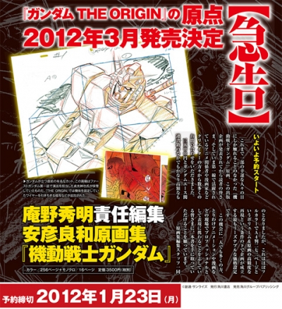 『機動戦士ガンダム』で安彦良和氏が手がけた原画を編纂する「庵野秀明責任編集 安彦良和原画集『機動戦士ガンダム』編」が、角川書店より2012年3月に発売される。