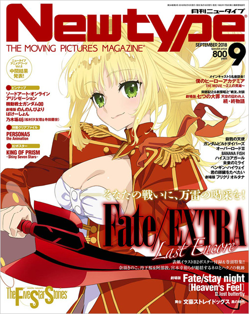 本日8月9日(木)発売の「ニュータイプ 2018年9月号」は、『Fate/EXTRA Last Encore』が表紙と巻頭特集、付録のB2ポスターに登場。