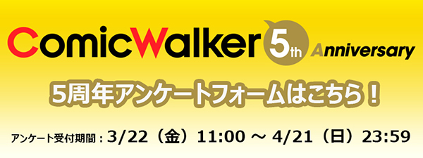 KADOKAWAの無料漫画総合サイト「ComicWalker」がサービス開始5周年を迎えた。それを記念して、安彦良和先生の記念イラストが公開されたほか、新たなサービス「試し読み動画」の配信開始や、QUOカード500円分が抽選で当たるアンケートキャンペーンがスタートした。
