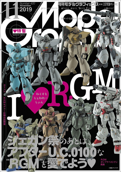 全国の8千万人の地球連邦量産機=RGMファンの皆さまお待たせしました!11月号の巻頭では「I❤RGM ねくすとじぇねれーしょん」ということでU.C.0100年以降のRGM系機体にスポットをあてた特集をお送りいたします。ジェムズガン、ジャベリン、ガンイージなどなど、これまであまり日の目をみなかったU.C.0100年以降のRGM系機体を、これを機にとことん楽しみつくそうではないですか!量産機って……いいよね……。