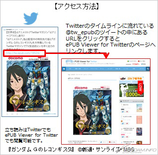 「dアニ+」とは、Twitterのタイムライン上で電子書籍を閲覧することができる「epub viewer for Twitter」を利用した、世界初のTwitterマガジン。「dアニメストア」のTwitter公式アカウント( @docomo_anime)の「dアニ+」に関するツイートから直接閲覧することができるほか、同ツイートに記載されているURLからアクセスすることも可能となっている。