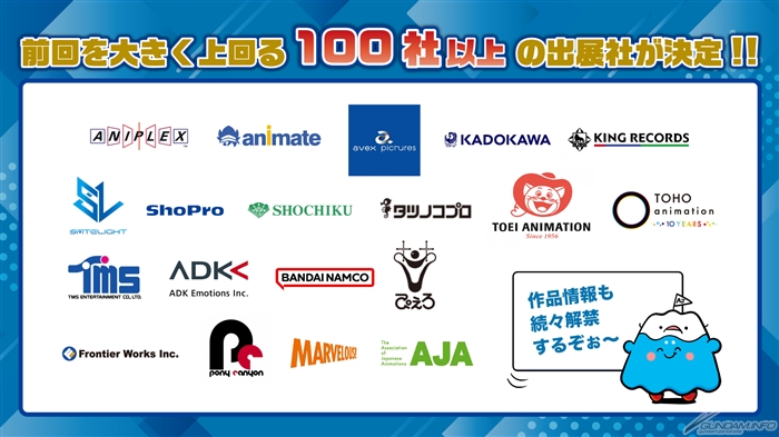『機動戦士ガンダム 水星の魔女』をはじめとしたガンダムシリーズ、「ラブライブ!」シリーズ、「転生したらスライムだった件」、「SANDLAND」といった最新作・人気シリーズを、展示や映像で紹介。物販コーナーも実施予定。