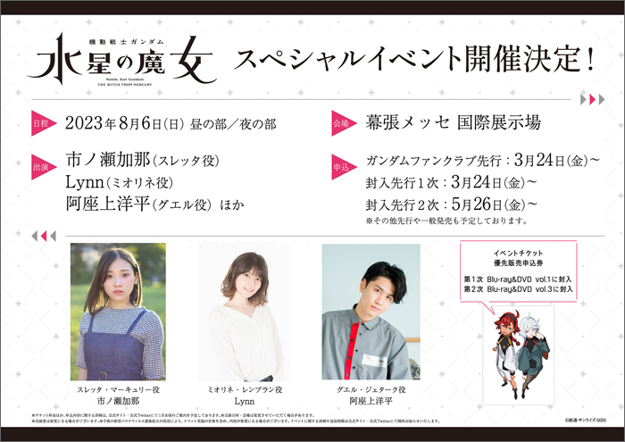 なお、チケットの抽選申込は、3月24日(金)より、“ガンダムファンクラブ(GFC)先行”および、「機動戦士ガンダム 水星の魔女 vol.1」のBlu-ray&DVDに封入される申込券による“封入先行1次”の応募受付がスタート。