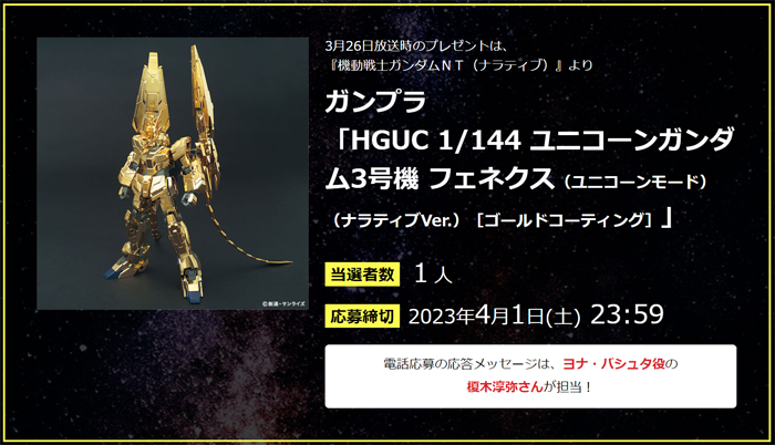 「放送連動プレゼント」は、ガンプラ「HGUC ユニコーンガンダム3号機 フェネクス(ユニコーンモード)(ナラティブVer.)[ゴールドコーティング]」が抽選で1名に当たるというもの。