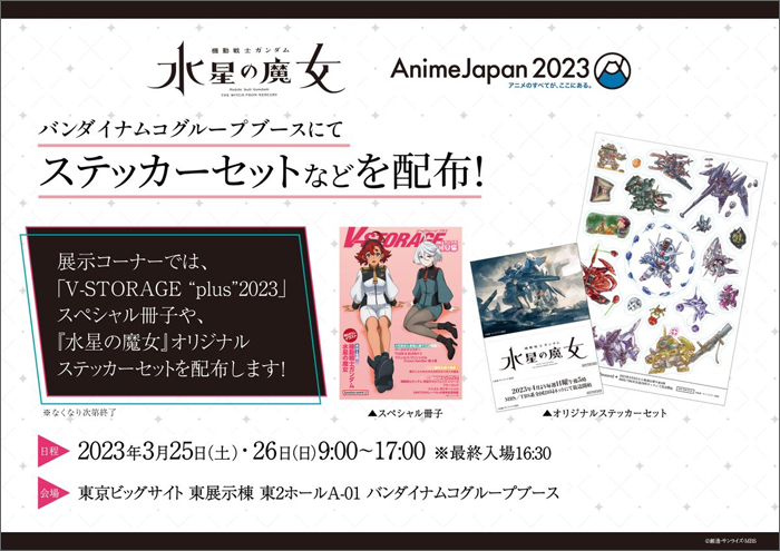 『機動戦士ガンダム 水星の魔女』をはじめとしたガンダムシリーズ、「ラブライブ!」シリーズ、「転生したらスライムだった件」、「SANDLAND」といった最新作・人気シリーズを、展示や映像で紹介。物販コーナーも実施予定。