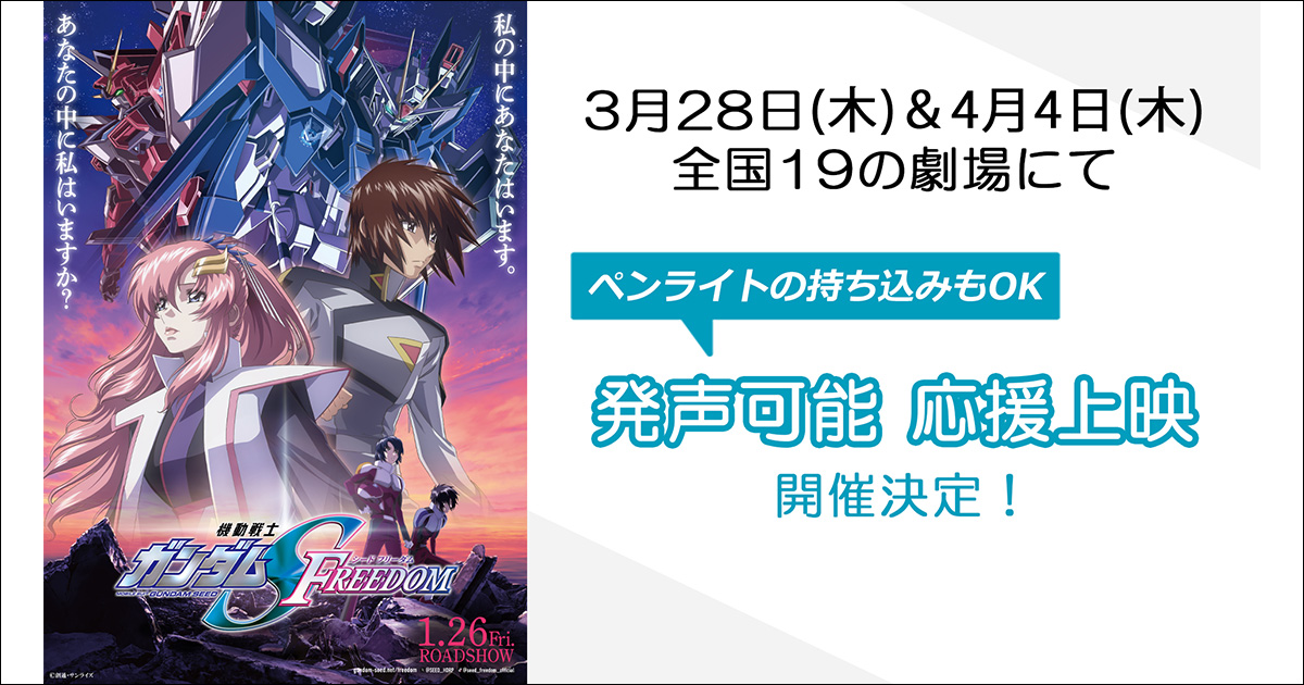 全国19の劇場にて、『機動戦士ガンダムSEED FREEDOM』発声可能応援上映の実施が決定した。