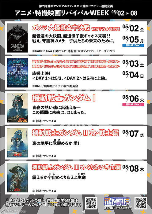 「アニメ・特撮映画リバイバルWEEK」は、「第2回 熊本マンガアニメフェスタ」と熊本ピカデリーの連動企画として、5月2日(金)から8日(木)まで実施される上映イベント。『機動戦士ガンダム』劇場版三部作のほか、アニメ・特撮映画全5作品が上映される。