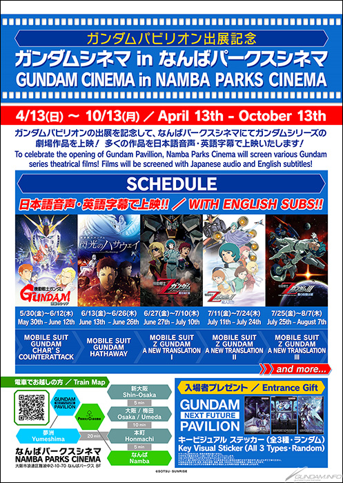 ガンダムシリーズの劇場作品を日本語音声・英語字幕で上映するほか、入場者プレゼントとして「GUNDAM NEXT FUTURE PAVILION」キービジュアルステッカー(全3種・ランダム)が配布されている。チケットは上映日の3日前の17:00より、なんばパークスシネマ公式サイトにて順次発売。