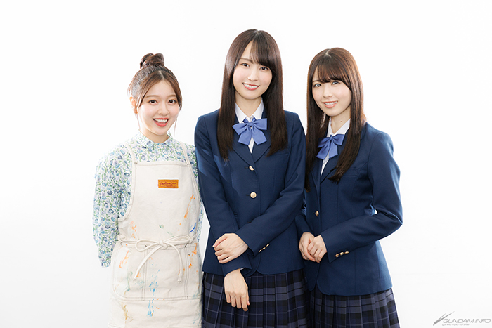 今回、ガンダムインフォでは、高嶺瑠夏役の賀喜遥⾹(乃木坂46)さん、瀬⼾流歌役の筒井あやめ(乃木坂46)さん、ナツ役の尾本侑樹奈(LINKL PLANET)さんへインタビュー。キャスト陣の仲の良さが垣間見えるエピソードも飛び出したので、早速レポートしていこう。