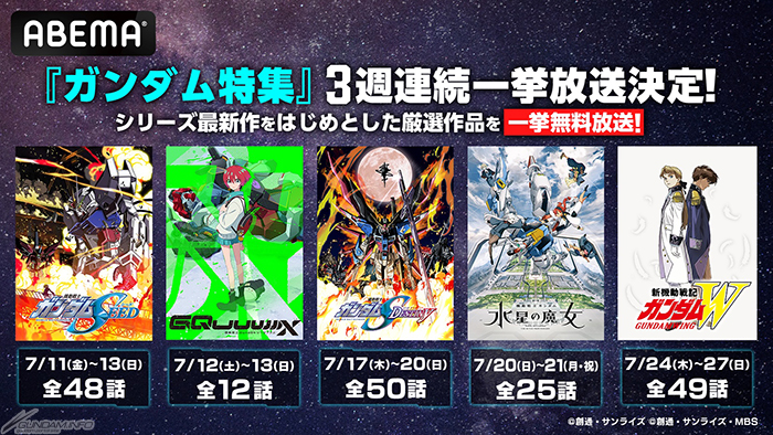 新しい未来のテレビ「ABEMA」にて、『機動戦士Gundam GQuuuuuuX 』『新機動戦記ガンダムW』『機動戦士ガンダムSEED HDリマスター』『機動戦士ガンダムSEED DESTINY HDリマスター』『機動戦士ガンダム 水星の魔女』の無料一挙放送が、7月11日(金)より3週連続で実施されることが決定した。