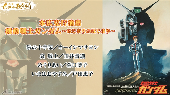 スペシャルステージ「機動戦士ガンダム~はじまりのはじまり~」は、映画監督の本広克行さんが演出を担当。特別な映像とともに、オーイシマサヨシさんが「砂の十字架」を、玉井詩織さんが「哀 戦士」を披露するほか、森口博子さんが「めぐりあい」を、戸田恵子さんが「いまはおやすみ」を歌う。