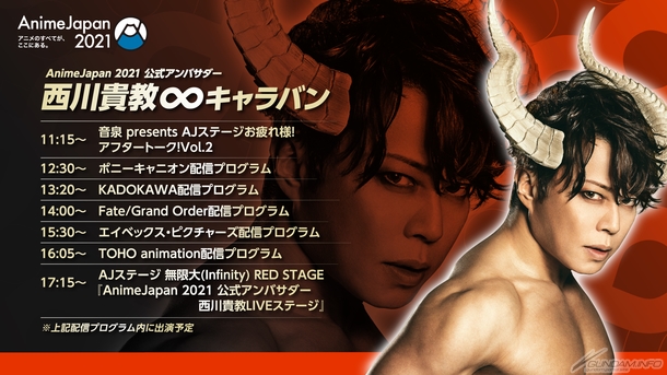 「AnimeJapan 2021」公式アンバサダーの西川貴教さんが出演するプログラムが解禁となり、全67プログラムの「AJステージ」および「AJスタジオ」すべてのラインナップが一挙公開された。
