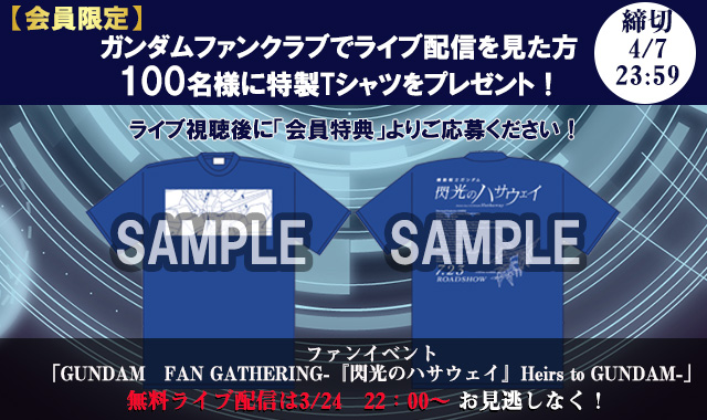 公式アプリ「ガンダムファンクラブ(GFC)」では、3月24日(火)22:00より配信される「GUNDAM FAN GATHERING-『閃光のハサウェイ』Heirs to GUNDAM-」を視聴したGFC会員を対象に、入場特典で用意されていた「特製Tシャツ」を抽選で100名にプレゼントすることが決定した。