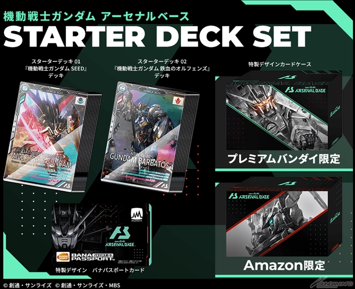 『機動戦士ガンダムSEED』と『機動戦士ガンダム 鉄血のオルフェンズ』のスターターデッキ(各カード10枚)と、特製デザインのバナパスポートカード、カードケースがセットになった、「機動戦士ガンダム アーセナルベース スターターデッキセット」(税込み1,100円)の予約受付が、プレミアムバンダイ、Amazon.co.jpにて本日よりスタートした。特製カードケースのデザインは各販売サイトで異なる2種となっている。