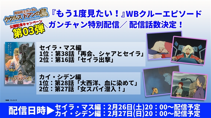 映画『機動戦士ガンダム ククルス・ドアンの島』の公開記念キャンペーン「『もう1度みたい!』WBクルーエピソード」にて、“セイラ・マス編”と“カイ・シデン編”の配信話数が決定した。