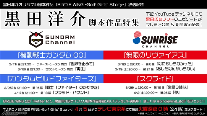 脚本家の黒田洋介さんがシリーズ構成を担当する新作オリジナルアニメーション『BIRDIE WING -Golf Girls’ Story-』の放送決定を記念する“黒田洋介祭り”として、『機動戦士ガンダム00』セカンドシーズン第25話「再生」が、本日3月18日(金)21:30よりYouTube ガンダムチャンネルで期間限定配信される。