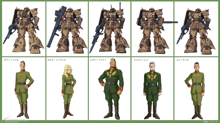 今回公開されたのは、本作で描かれる新設定「サザンクロス隊」のエグバ・アトラーやウォルド・レンら5名と、各隊員の「MS-06GD 高機動型ザク(地上用)」の設定画。