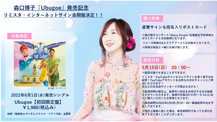 映画『機動戦士ガンダム ククルス・ドアンの島』の主題歌で、森口博子さんが歌う「Ubugoe」の“発売記念インターネットサイン会”が、5月15日(日)20:00よりリミスタYouTube Liveで開催されることが決定した。