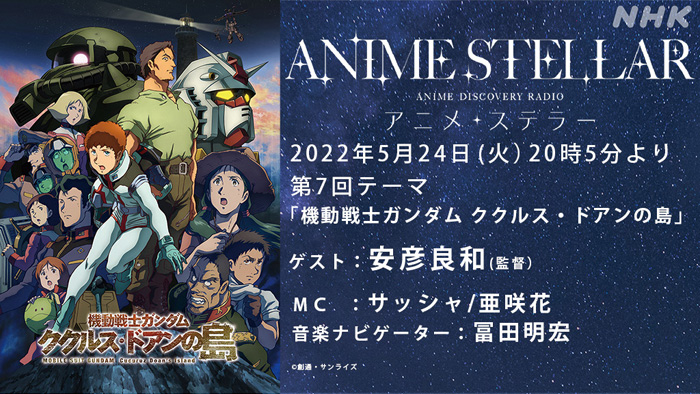 NHKラジオ第1で毎週火曜20:05から放送中の「アニメ・ステラー」では、明日5月24日(火)放送回に、『機動戦士ガンダム ククルス・ドアンの島』より安彦良和監督が出演する。