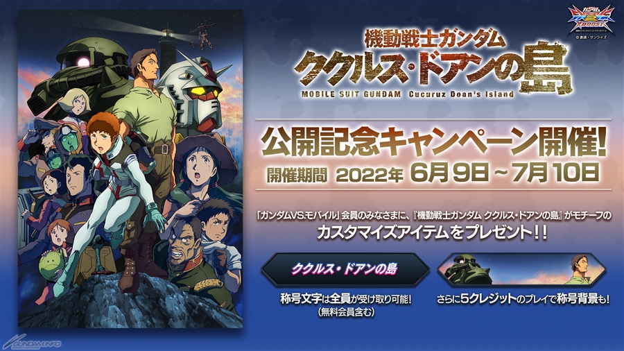 全国のゲームセンターで好評稼働中の2on2チームバトルアクションゲーム「機動戦士ガンダム エクストリームバーサス2 クロスブースト」(EXVS.2 XB)では、「ガンダムVS.モバイル」会員に『機動戦士ガンダム ククルス・ドアンの島』がモチーフのカスタマイズアイテムがプレゼントされる。この機会をお見逃しなく。