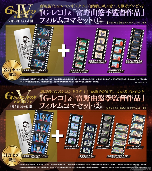 入場者特典は、「『G-レコ』&『富野由悠季監督作品』フィルムコマセット」で、劇場版『Gのレコンギスタ』第4部・第5部と、富野由悠季監督作品より厳選した計9作品より、フィルムコマを2枚セットで配布。