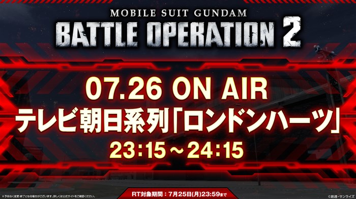 バンダイナムコエンターテインメントよりPS5/PS4向けに好評配信中のオンライン専用ゲーム「機動戦士ガンダム バトルオペレーション2」(バトオペ2)は、4周年を記念した一度きりのTVCMを、7月26日(火)23:15からテレビ朝日系列で放送される「ロンドンハーツ」内で公開する。
