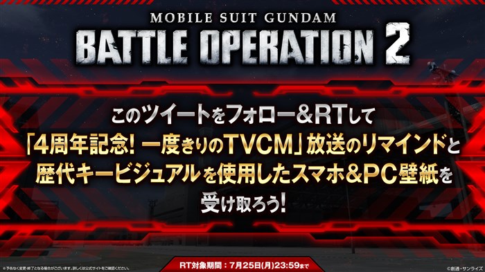 バトオペ2公式Twitter(@gundambattleope)をフォローの上、対象ツイートをRTすると、