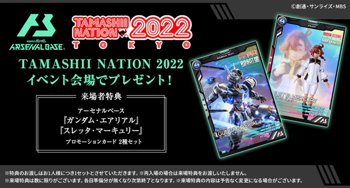 リアル会場は、魂ネイションズ史上初、ベルサール秋葉原3フロアをフルに使った大ボリュームの商品展示を予定。来場者特典「『機動戦士ガンダム アーセナルベース』プロモーションカード」などを配布するほか、開催記念商品や、スタンプラリーも用意されている。