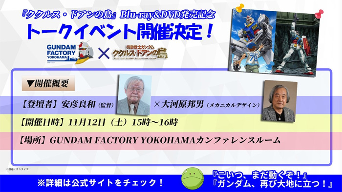 横浜・山下ふ頭の「GUNDAM FACTORY YOKOHAMA」(GFY)にて、『機動戦士ガンダム ククルス・ドアンの島』監督の安彦良和さんと、メカニカルデザインの大河原邦男さんによるスペシャルトークイベントが11月12日(土)に開催されることが決定した。参加費無料。