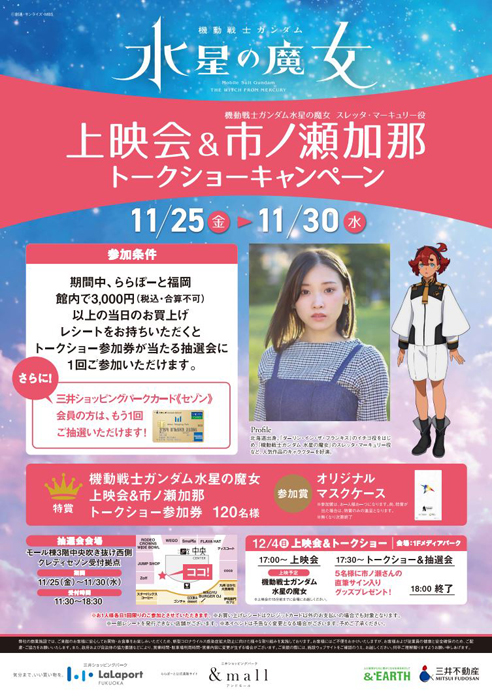 抽選会期間中、ららぽーと福岡館内で3,000円(税込・合算不可)以上の当日の購入レシートを会場まで持参すると、『機動戦士ガンダム 水星の魔女』スレッタ・マーキュリー役の市ノ瀬加那さんのトークショー参加券が当たる抽選会に1回参加できる。