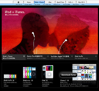 おっ と、その前に。「iTunes Store」にアクセスするためには「iTunes」という無料ソフトのインストールが必要です。PCにまだこのソフトがインストールされていない場合 は、アップルのサイトにアクセスして「iTunes」ページからダウンロードしてください。
