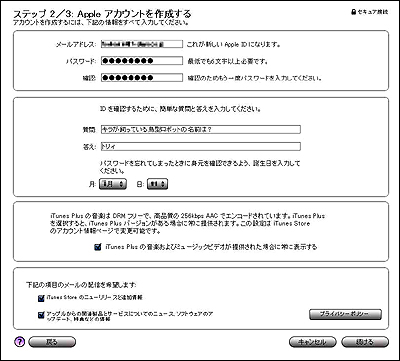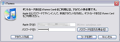 初めて「iTunes Store」に登録する場合は、空欄を無視して「アカウントの作成」ボタンをクリックしてください。既にアカウントをお持ちの方はIDとパスワードを入力します。