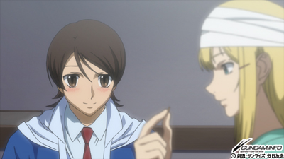 ■トリニティVSグラハム! アメリカにあるアイリス社の軍需工場を襲撃するスローネ。工場にいた800名の民間人も容赦なく殺戮する。グラハムはハワードの仇を取るため、単機で出撃する。 グラハムは性能差をものともせず、限界寸前の加圧Gに耐えながらフラッグを操縦し、スローネアインの腕を破壊する。一矢を報いたグラハムであったが、体に相当の負担を受けてしまい、吐血する。 |