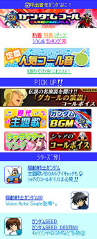 ガンダムコールとは 機動戦士ガンダムシリーズの音楽や、キャラクターボイスのコール音を配信しているサイトです。歴代のテーマソングやBGM、キャラクターソングなどを取り 揃えて配信しております。特に、ここでしか聴けないシャアのコールボイスは必聴です。時に紳士に、時に戦略的に、時に兄として、あなたの電話をお繋ぎして くれます。 ◆対応機種 ドコモ:FOMA900、700以降 KDDI:WIN端末 ◆アクセス方法 (iモード)メニューリスト⇒メロディコール⇒アニメ/ゲーム/効果音⇒ガンダムコール (EZweb) au oneトップ⇒カテゴリ(メニューリスト)⇒待ちうた⇒アニメ・ゲーム⇒ガンダムコール ◆料金:月額105円(税込)/楽曲ごと |