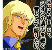 電話の相手にも、シャアの伝説の名演説を聴かせよう! シャアの呼出音で話題の「ガンダムコール」で、ついにダカールの演説が配信開始! ~コール音内容~ 「私は、エゥーゴのクワトロ・バジーナ大尉 であります。話の前にもう一つ知っておいてもらいたい事があります。私はかつてシャア・アズナブルという名で呼ばれたこともある男だ。私はこの場を借り て、ジオンの遺志を継ぐ者として語りたい。 もちろんジオン公国のシャアとしてではなく、ジオン=ダイクンの子としてである。……(つづく)」 |