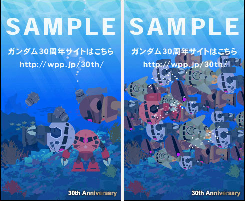 今回は、待受画面を可愛らしくデフォルメされた水陸両用のモビルスーツ達が携帯を開くたびにスイスイーッと泳ぎまわります。 登場するモビルスーツはシャア専用ズゴック・アッガイなど独特の丸みを帯びたフォルムが特徴のモビルスーツ達(シャア専用ズゴック・ズゴック・アッガイ・ゴッグ・ゾック)。 一定の確率でモビルスーツが大量に横切った後、劇中の特徴的なアクションが再現されます。 戦闘シーンでのモビルスーツ達からは予想できない水中での意外な姿に癒されること間違いナシ! |