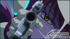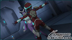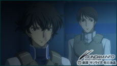 ライル、刹那に銃を向ける プトレマイオス2は、差出人不明の暗号通信を頼りに、ラグランジュ5にあるコロニー、エクリプスに進路を向けていた。そんな中、出撃準備のため格納庫に向かう刹那をライルが呼び止め、アニューの死後、刹那に対して行った暴行を謝罪する。だがライルは去り行く刹那の背中に向けて、衝動的に銃を構える。引き金は引かなかったライルだが、アニューを失った悲しみがその精神を不安定にしていた。 |