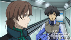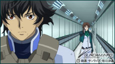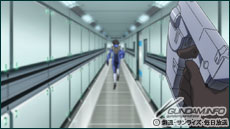 刹那、留美からヴェーダ本体の場所を教えられる 沙慈と共にダブルオーライザーで出撃した刹那はコロニー「エクリプス」に到着、単身で内部に潜入する。そこで刹那は、重傷を負った留美と出会う。留美からヴェーダの場所が記されたメモを受け取った刹那はダブルオーライザーに戻ろうとするが、ブシドーが乗るMS・スサノオが眼前に現れる。コクピットから姿を現したブシドー=グラハム・エーカーから一騎打ちを要求された刹那は、機体を取り戻すためにその果たし合いを受け入れる。 |