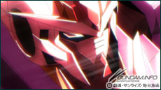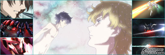 グラハム、刹那との果たし合い ルイスがネーナを死に至らしめた頃、同じ宙域では、刹那とグラハムによる一騎打ちが続いていた。刹那と戦うためだけにイノベイターの傀儡となったグラハムの気迫に、押される刹那。状況の打開を図った刹那は、ダブルオーライザーのトランザムを発動。するとグラハムのスサノオもトランザムを発動し、大量のGN粒子が戦闘宙域に広がると、ふたりの意識は量子空間に飛ばされる。 |