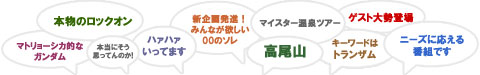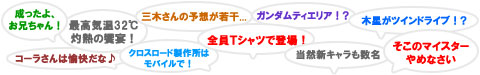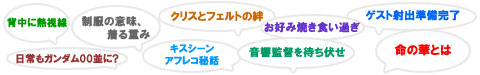 | 今週のモバイルラジオは? 今週のモバイルラジオは、劇場版ガンダム00宣伝チームの皆さんがスタジオに登場!いつも聴いて下さっているリスナーさんの為に 「ガンダムお宝鹵獲作戦」を決行!超レアで豪華なアイテムが何なのかはモバイルを聴いてのお楽しみ! 応募はモバイルサイトから受け付けていますので、是非チェックしてみてくださいね! |