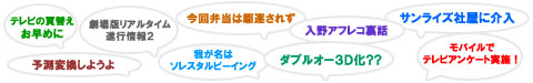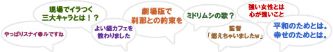 | 今週のモバイルラジオは? 今週のモバイルラジオは劇場版公開直前スペシャル! 制作を終えたばかりの水島監督がご登場!その熱い想いと感動をお届けします。 劇場版を公開するにあたって、監督からユーザーの皆さんに調査したい内容とは一体!? 水島監督と入野さんからのスペシャルプレゼントはラジオを聴いてからのお楽しみ! 応募はモバイルサイトから受け付けていますので、是非チェックしてみてくださいね♪ |